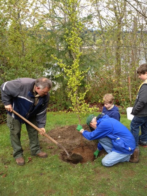 Mark Petranek, scoutmaster of Boy Scout Troop 1502, joins Poulsbo Tree Board Chairman Bill Lockard and scouts in planting one of three stewartia, a flowering tree, in American Legion Park April 20.