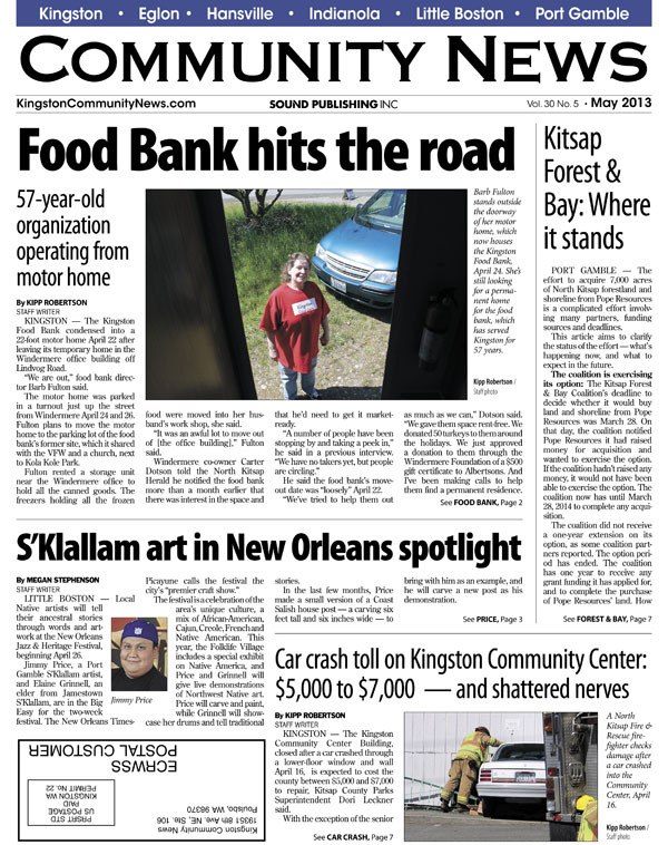 KINGSTON — The Kingston Food Bank is now operating out of a 22-foot motor home. A status report on the Kitsap Forest & Bay Project. S’Klallam artists are introducing New Orleans to Northwest culture. A car crash causes up to $7,000 in repairs to the Kingston Community Center — and a lot of frayed nerves.