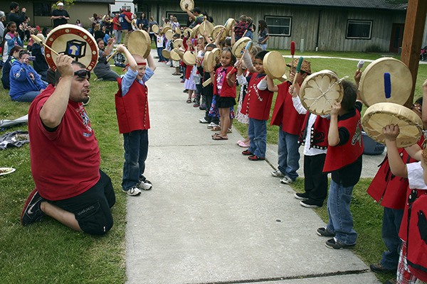 The students embark on their future well-prepared. For two or three years, each participated in activities geared to help them grow emotionally, mentally, physically and socially. And they participated in culturally based activities. The children helped collect cockles that were baked traditionally and offered for lunch at the Head Start graduation ceremony June 7 in Little Boston. At the ceremony, they sang and drummed S’Klallam-language songs they learned. They wore red vests decorated by their families, drummed on drums made for them by their families, and wore woven cedar hats or cedar headbands and other articles of traditional clothing.