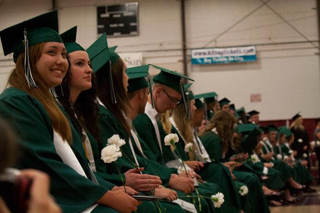 Klahowya students who have received their diplomas watch as their fellow seniors come down from the stage on Thursday.