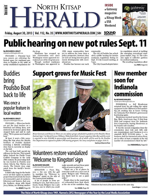 Inside the Herald, you’ll find local news, Editorial, Letters to the Editor, Editor’s Notebook by Richard Walker, Public Meetings, Neighbors Helping Neighbors by Mary Nader, Sports & Outdoors, a story and photos about the Sept. 7 Poulsbo Music Festival, North Kitsap Business, Health & Wellness Directory, North Kitsap Calendar, At Your Service Directory, Obituaries, Newsmakers, Worship Directory, Legal Notices, Sheriff’s Log, Police Calls, 6th Avenue Update, Kitsap Week Life and Culture, Kitsap Calendar, Sound Classifieds and Real Estate Now, Weekend Open Houses, Gluten Free Foodies.