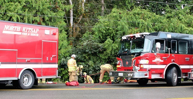 North Kitsap Fire and Rescue were dispatched at 3 p.m. to the intersection of Miller Bay and West Kingston roads. It took crews roughly 3 minutes to reach the site as it was just down the road from the fire station.