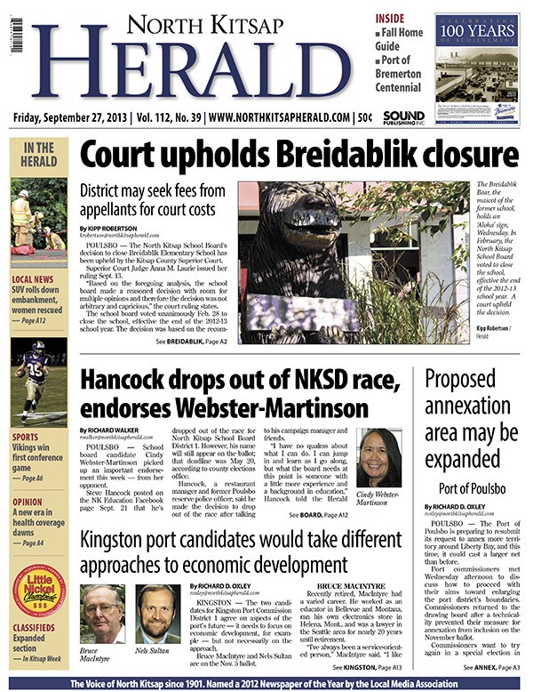 POULSBO — A Kitsap County Superior Court judge upheld the North Kitsap School Board’s decision to close Breidablik Elementary School. Steve Hancock drops his bid for the North Kitsap School Board and endorses Cindy Webster-Martinson. The candidates for Kingston Port Commission District 1 differ on their approach to economic development. The Port of Poulsbo is seeking to enlarge its boundaries beyond the Poulsbo city limits.