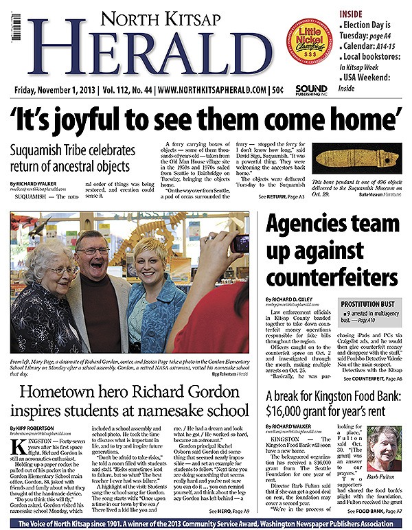 POULSBO — Ancestral objects are returned to the Suquamish Tribe. Agencies team up against counterfeiters. Kingston Food Bank gets a $16,000 grant for rent. Astronaut Richard Gordon visits his namesake school.
