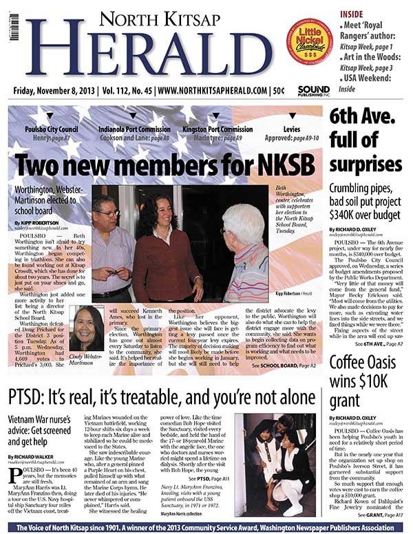 POULSBO — A look at the newest members of the North Kitsap School Board. Upgrades to 6th Avenue are $340,000 over budget. Coffee Oasis wins a $10,000 grant. A Vietnam War nurse talks about PTSD.