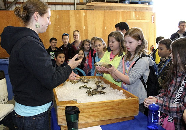 Jennifer Whipple, educational outreach director for Taylor Shellfish Farms, stood behind an icebox filled with various shellfish for students to pick up.