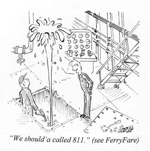 811 is the “call before you dig” line. I learned about 811 after sensationally locating our neighborhood water pipe with a post hole auger. Whenever I’m at a loss for a ferry cartoon something happens, like drilling a hole in Walla Walla’s bottom to drain the bilge water.