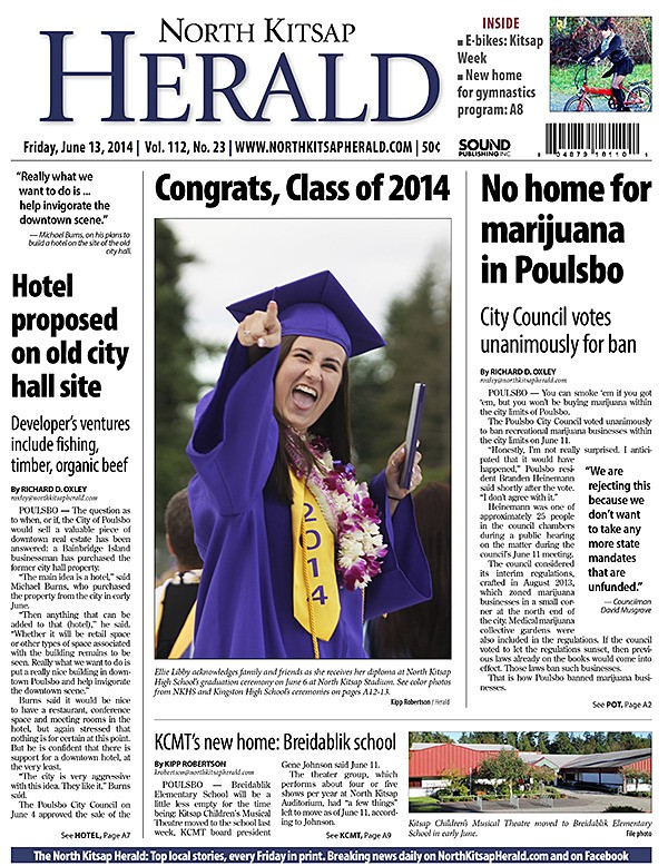 POULSBO — Poulsbo City Council bans retail marijuana operations. A hotel is proposed on the old city hall site. KCMT moves to Breidablik Elementary School. The Class of 2014 celebrates.