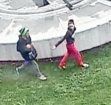 In the videos, a white female suspect has brown hair in a bun. She was wearing red/orange pants, Converse style shoes and a dark long-sleeve shirt with three large white letters. A male from the footage was wearing a dark jacket, grey pants, white/grey shows, a light/dark green striped stocking hat and carrying a backpack.
