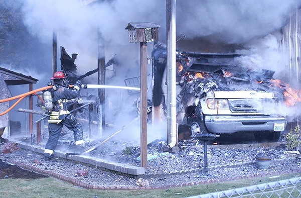 A South Kitsap Fire and Rescue firefighters applies foam onto a 30-foot motorhome that was destroyed in an Oct. 28 fire behind a home on Harris Road SE near SE Abernathy Court. Crews were dispatched to the fire about 1:40 p.m. and were able to extinguish the fire