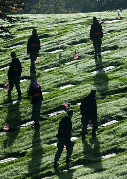 Standing in formation, 150 cadets from the Washington State Academy attentively listened to their morning orders: to place hundreds of small U.S. flags at the graves of veterans buried at Miller-Woodlawn Memorial Park in Bremerton.