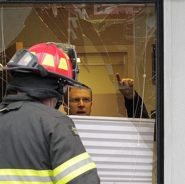 A Subaru Forester crashed into The Doctors Clinic on 7th Avenue, then backed over a tree and into a pickup truck, Nov. 25. Poulsbo firefighters check the integrity of the building and check for electrical-wire damage that could lead to a fire. Kipp Robertson / Herald