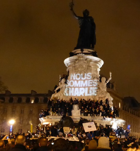 It was exhilarating to chant, “Charlie, Charlie,” “Liberté-Expression,” sing the French national anthem, read banners and be enveloped in the immense crowd. We shuffled for five hours through Place de la Republique and along the 3-kilometer route to Place de la Nation. Early on, it rained softly. For a few moments, a rainbow shimmered above the bronze statue in the center of the square. As darkness descended, we applauded the police and gendarmes guarding side streets along Boulevard Voltaire, chanting “Merci de la Police.”