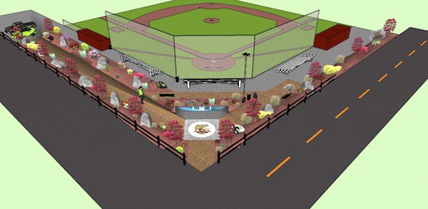 A 16-by-16-foot monument in the shape of a baseball field will be developed against a hillside in the center of the gardens. Each brick will be placed at the player’s position on the baseball diamond. A gray paver-stone inset, which will include the school’s crest in bronze, will run almost 100 feet through the gardens.
