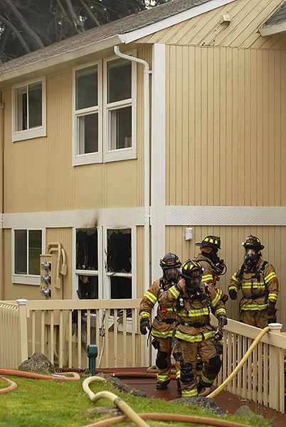 A firefighter exits the “C” building where an apartment fire broke out April 23 at Centennial Apartments in Bremerton.