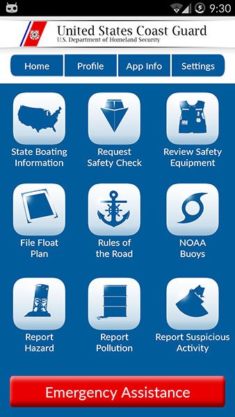 The app also features an emergency assistance button which, with locations services enabled, will call the closest Coast Guard command center.