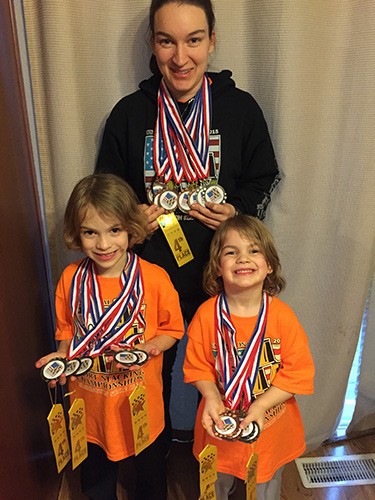 Dawn Burns, 31, and her two daughters, Alexandria, 7, and Mackenzie, 5, won a total of 16 medals. At age 4, Mackenzie was the youngest stacker at the competition. Sister Alexandria, age 6 at the time, has a potential state and national record which is pending video approval from the World Sport Stacking Association.