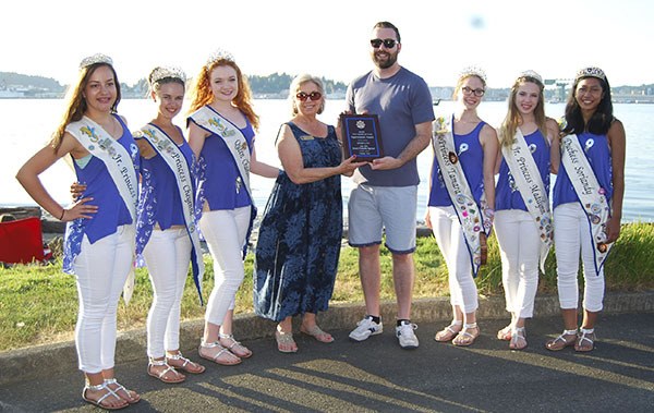 It takes money to put on a first-class fireworks show, Fathoms O’ Fun chairwoman Sharron King reminded. King shows her appreciation to show sponsor WAVE and the company’s representative, Joe Francis, by presenting him with a plaque for their funding participation. Also thanking Francis is, left to right, Junior Princess Maria Hoyt; Princess Cheyenne Werbelo; Queen Charlotte Whitten; King; Francis; Princess Tamara Medal; Junior Princess Madilynn Mackie; and Duchess Soriandy Sutman.