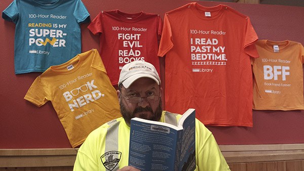How does it work? Any adult over the age of 18 simply tracks the number of hours read on a tracking form. Once 10 hours is reached, he or she can come into any library to claim a brightly colored button that states, “Reading is My Super Power,” or “Book Nerd,” “BFF: Book Friend Forever,” or “I Read Past My Bedtime,” or, finally, “Fight Evil. Read Books.” Our next step is to encourage adults to come in with their trackers after they have read for 100 hours in order to claim an adult-sized T-shirt in a range of bright colors that sport these same proud statements.