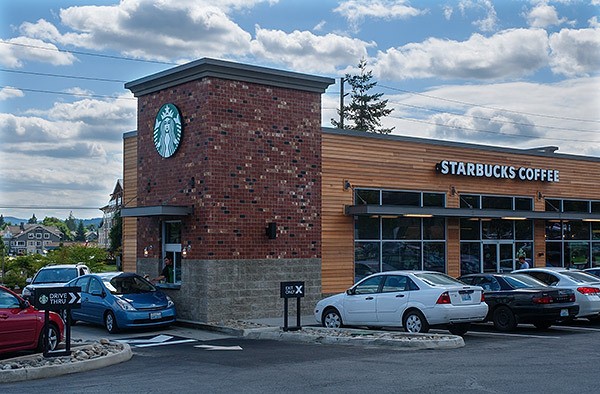 A Starbucks employee hands a drink to a drive-thru customer at the new Silverdale store Aug. 6.