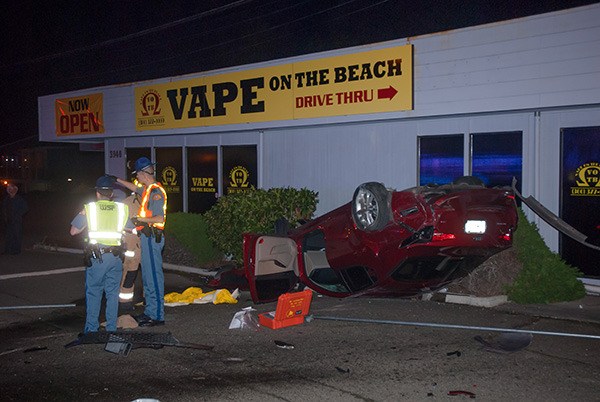 The Kia then struck the curb on the north side of Kitsap Way, causing it to roll. It came to rest on its roof next to the Vape on the Beach store located north of Kitsap Way.
