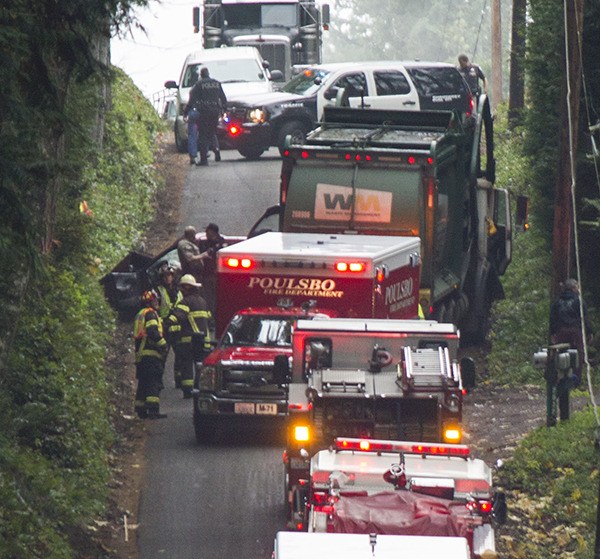 One man was killed and another man was medflighted to Harborview Medical Center after their car collided with a refuse truck on Sawdust Hill Road. Photo: Jody Matson / Poulsbo Fire Department