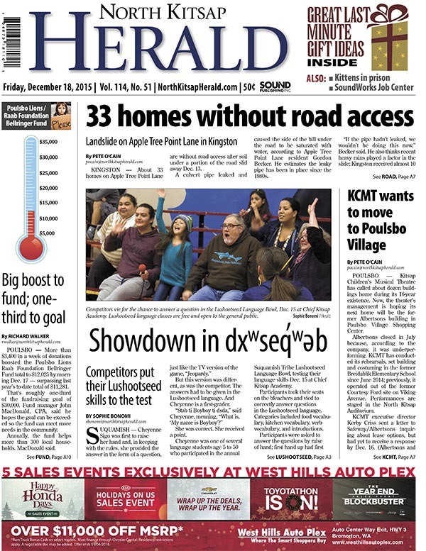 POULSBO — A Kingston neighborhood is cut off from emergency services by a road collapse. KCMT wants to move to Poulsbo Village. Competitors put their Lushootseed skills to the test. Local fund is one-third of the way to its goal.