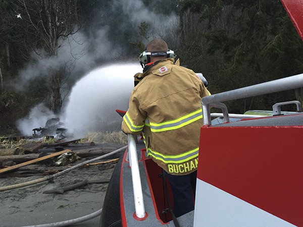 The first officers to arrive found the building fully involved in flames. With only a dangerously narrow and unimproved switchback trail stretching thousands of feet from the bluff to the beach, crews sought alternatives to reach the fire, Laboda reported. A crew responded in NKF&R’s new fire-rescue boat from the Port of Kingston Marina while other firefighters used Twin Spits Road to access the beach for the long hike to the scene. Poulsbo Fire personnel trailered an off-road vehicle from their Poulsbo headquarters to help ferry firefighters and equipment across the long distance. Crews used sea water supplied by the marine unit to fully extinguish the fire.