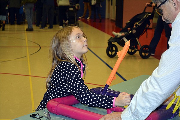 Students — and several parents who were equally intrigued — were able to position the compressor to the angle they wanted and pull the lever to shoot their rocket in the air.