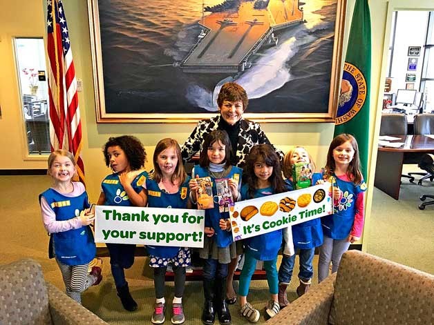 Bremerton Mayor Patty Lent poses with Girl Scouts with Bremerton Daisy troop 42186 in her office to kick off the Scouts’ annual cookie sale. Community booth sales begin March 3.