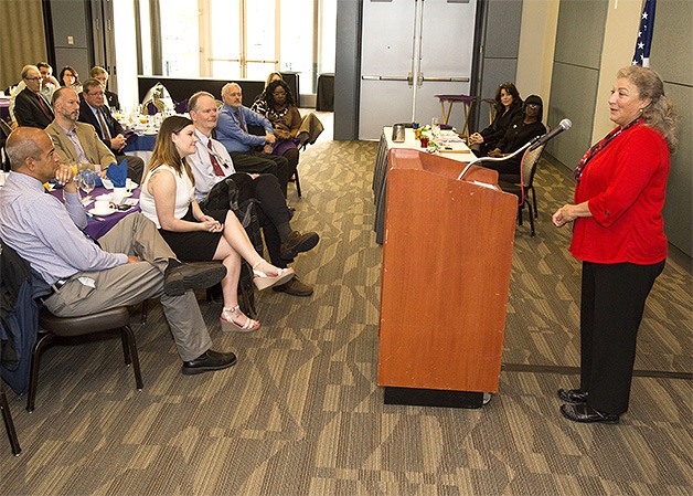 Army veteran Colleen McAleer speaks to attendees of Puget Sound Naval Shipyard and Intermediate Maintenance Facility’s annual Women’s History Month breakfast. McAleer addressed attendees on civil servant leadership and shared her experiences in the military and the business community, and as the first female commissioner for the Port of Port Angeles. PSNS & IMF’s Professional Women’s Employee Networking Group, one of seven employee-led resource groups at the command, hosted the event at the Kitsap Conference Center. U.S. Navy Photo Jeremy Moore
