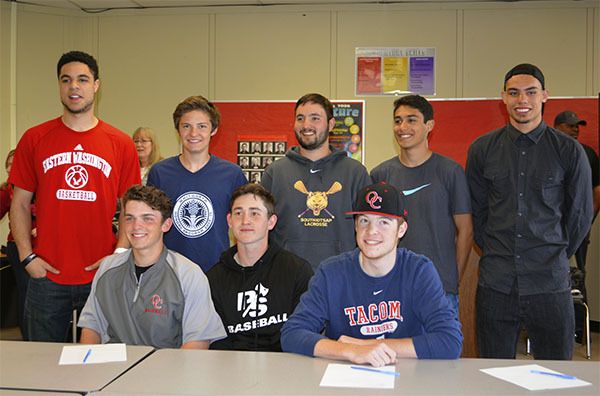 Nine South Kitsap athletes, including one who couldn’t attend the ceremony, signed their national letter of intent to play sports for their chosen colleges after graduation.