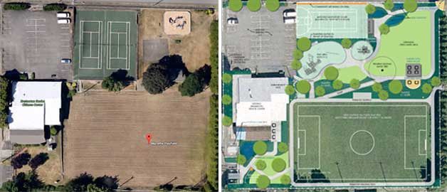 Left: Manette Playfield is considered a high priority for renovations. Right: The most recent concept for renovations includes redoing the tennis courts