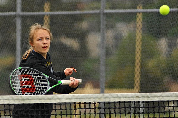 Bremerton High School’s Ysabel Kochis gets ready to return the ball during doubles play against North Kitsap High School at BHS May 4. NKHS won 7 sets to 0.
