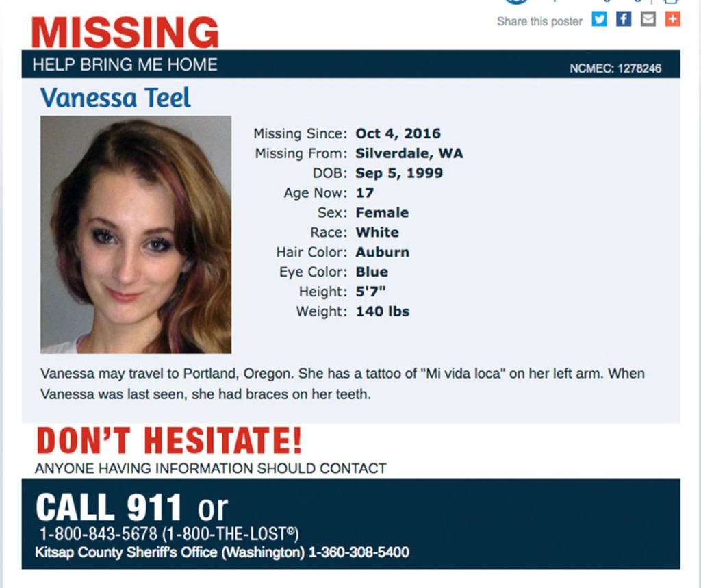 Vanessa Teel is described as a 17-year-old white female, with auburn hair and blue eyes, standing 5 feet 7 inches and weighing 140 pounds. She has “Mi vida loca” tattooed on her left arm. When she was last seen, she had braces on her teeth.