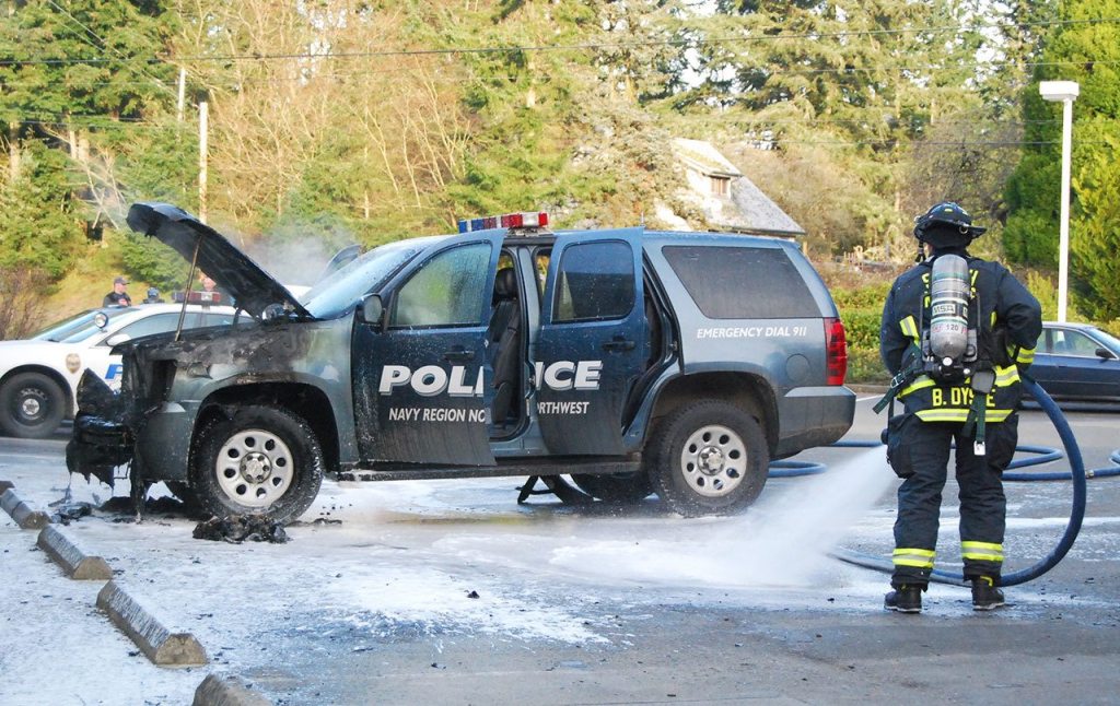The vehicle, owned by the Navy Region Northwest Police, was unoccupied and no injuries resulted from the fire. When SKFR fire engines arrived at about 9:15 a.m., flames were pouring out from the engine well.
