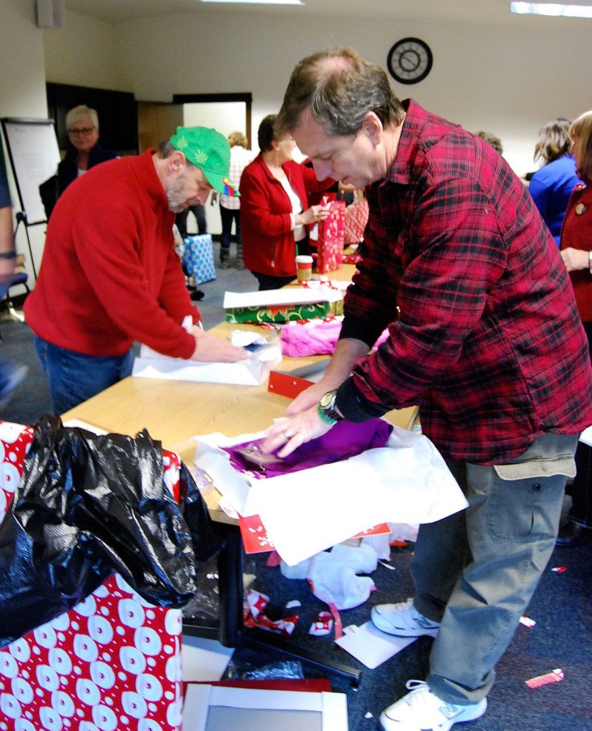 These are tight times for many South Kitsap families who have turned to South Kitsap Helpline for assistance. Many, in fact, are in such a precarious financial state that they don’t have money to buy Christmas presents for the kids or put a proper holiday meal on the table. With that in mind, about 30 volunteers from Rotary and the Port Orchard Soroptimist group — including non-members who just wanted to help — took over a large conference room at the fire station and wrapped hundreds of packages containing clothes, toys and anything suitable for Christmas gifts for 101 children.