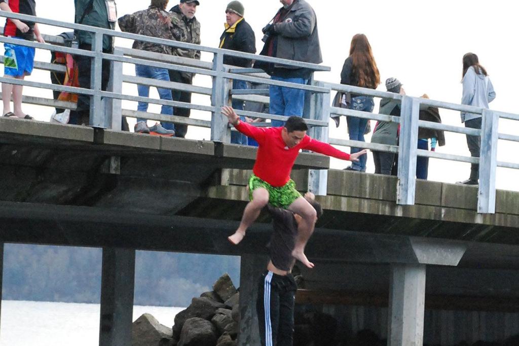 A touch of snow fell on the roads leading to the Polar Bear Plunge on New Year’s Day morning in Olalla. That and frigid near-freezing temperatures separated the football-watching softies from the hardy at the bridge next to Al’s Market, where dozens took the plunge into freezing Puget Sound.