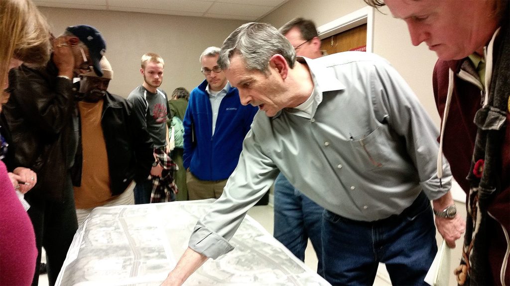 Community members review early plans for the Lebo Boulevard Improvement Project at a meeting Feb. 22, 2016.