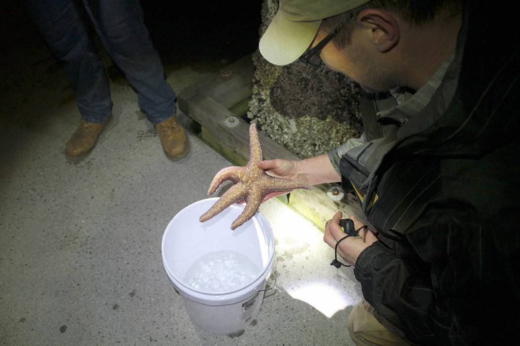 A beach naturalist carefully removes a Sea Star from one of the dock pilings so it can be displayed in the fish tank. The Sea Star and other living things in the tank were carefully returned to the water at the conclusion of the Pier Peer.                                Terryl Asla/Kitsap News Group