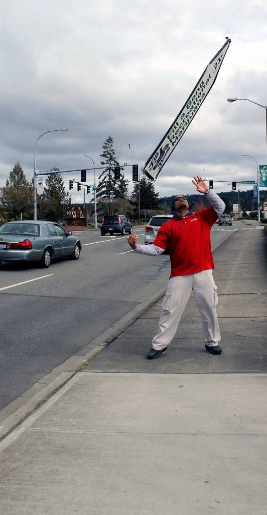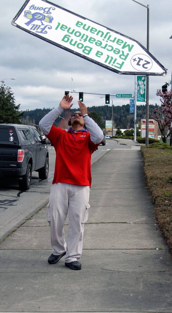 Many days, you can catch his performance on Silverdale Way as he spins his arrow for Fillabong, a cannabis store at 2839 NW Kitsap Place. The business is tucked away off the street, and assistant manager Crystal Eicher gives sign spinners a lot of credit for the store’s success.