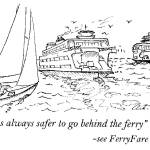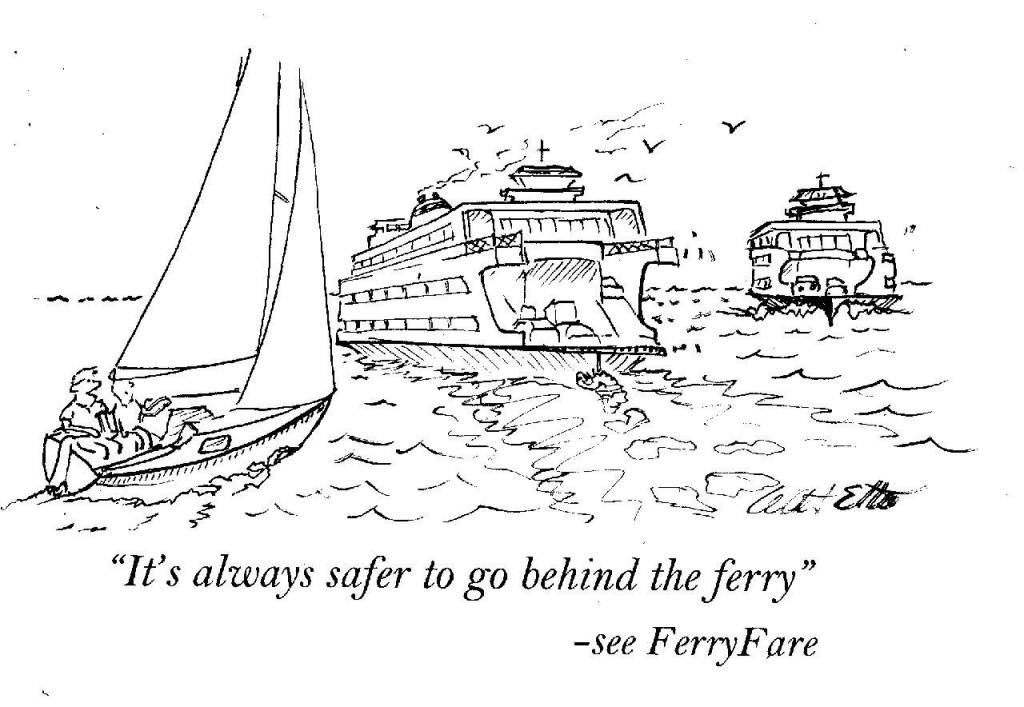 Here at Kingston, we hear ferry blasts during the summer and fishing seasons. Often there are a lot of small boats milling around and if the ferry tried to change course for each one there’d be aquatic anarchy. Instead, the ferry slows or stops while things sort out. Hint: talking to the ferry on channel 16 is a big help.