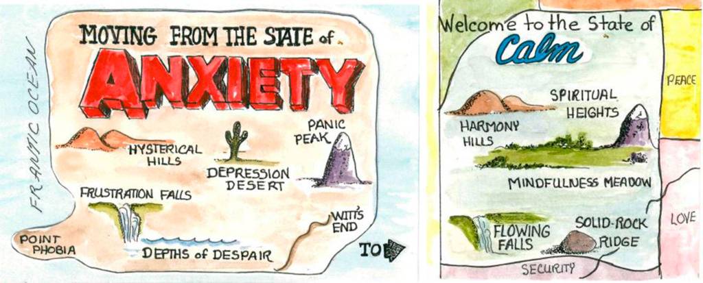 The visuals she uses look like maps of states, complete with geographic landmarks. There’s the State of Anxiety (no California jokes, please) bordered on the west by the Frantic Ocean, with Hysterical Hills, Depression Desert, Panic Peak, Frustration Falls, Depths of Despair, Point Phobia, and Wit’s End — feelings not unknown to most people.