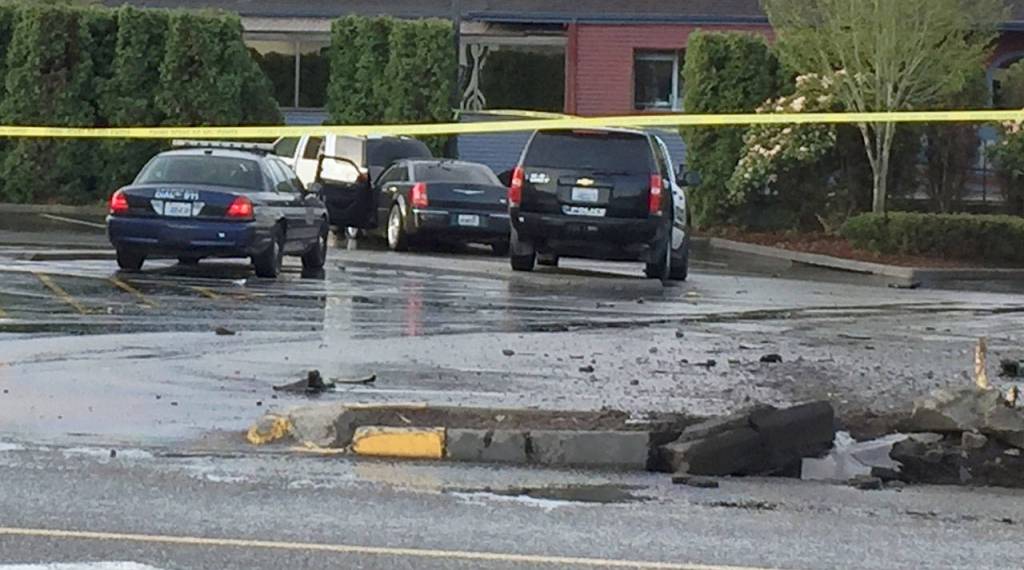 5:52 a.m.: Ahead of the pursuit, sheriff’s deputies put out spike strips on Silverdale Way on the south side of the Waaga Way overpass near the Home Depot exit. Its tires punctured, the suspect’s vehicle continued on Silverdale Way until suddenly it careened out of control, crossed the northbound lane of traffic and entered a McDonald’s parking lot. Crossing the lot, it destroyed a divider, then crashed into an older-model white GMC.
