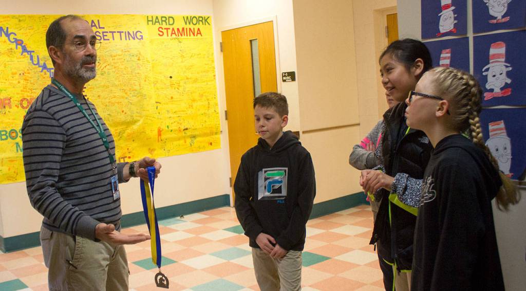As Orando greeted his class on his return to school, holding his medal from the Boston marathon, he touched on the importance of those life skills written on the motivational posters hanging outside his class — perserverence, goal setting and hard work.