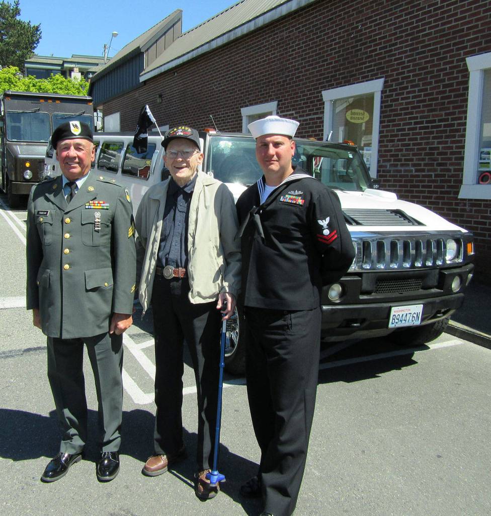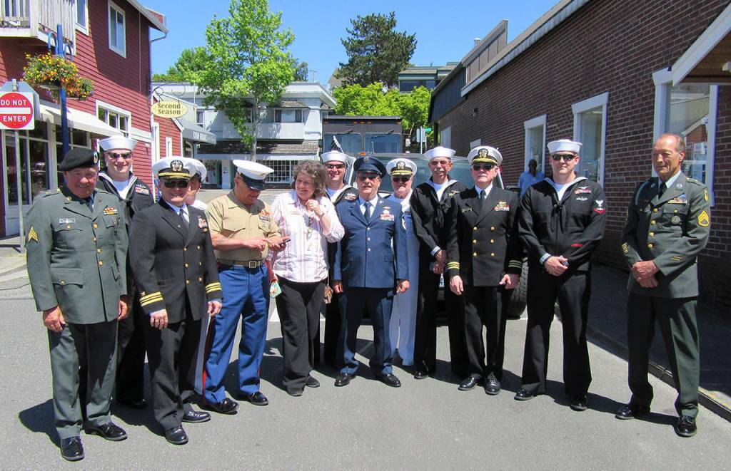 POULSBO — The white Humvee stretch limo that pulled up in front of the Brass Kraken on Poulsbo’s waterfront at 1400 hours May 26 was big enough to hold a squad of Marines. But in this case, the 13 uniformed individuals who dismounted consisted of 10 veterans and 3 active-duty personnel representing all of the services except the Coast Guard.