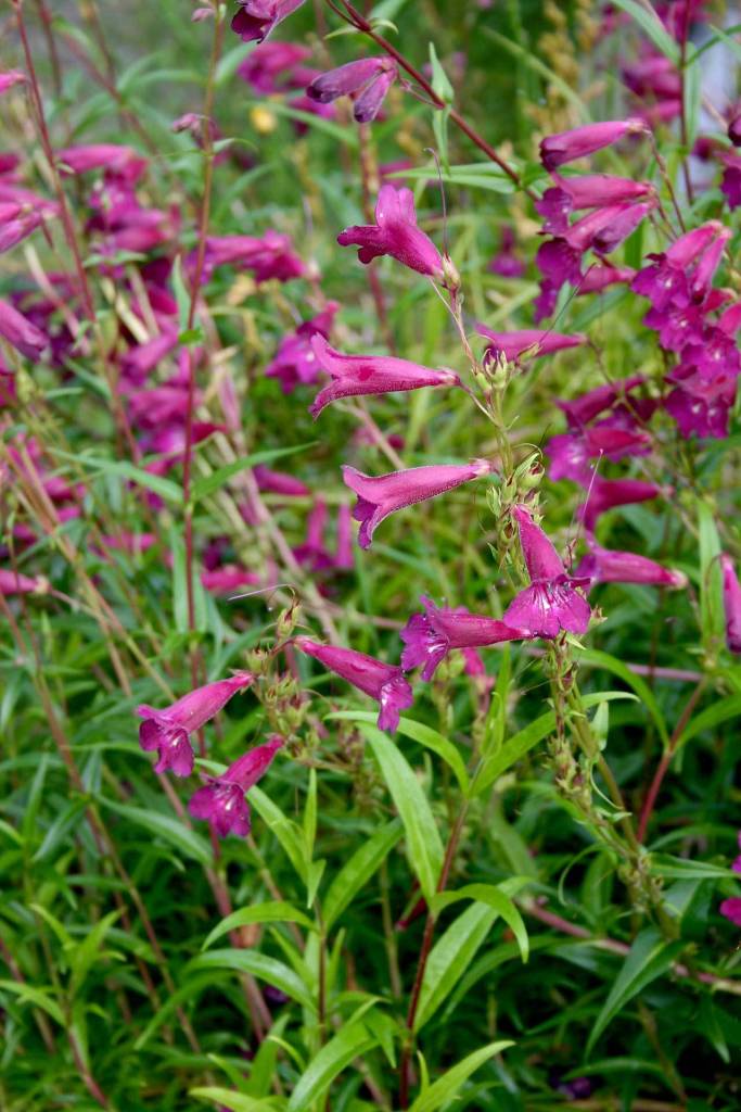Another floriferous and tall penstemon variety bred in England and easily found in nurseries in Kitsap County is Penstemon ‘Blackbird’. Red stems carry the tubular, deep reddish-purple flower and darker buds. Well grown specimens are known to carry up to 75 flowers per stem.
