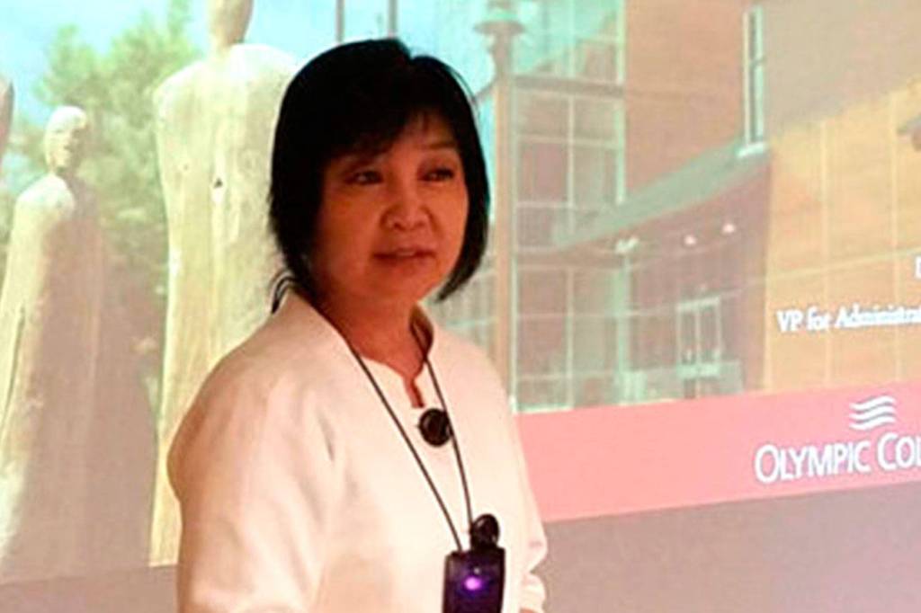 Dr. Kay Ash, vice president for Administrative Services at Olympic College, explains the partnership between the school and Western Washington University for a group of Seattle-area officials and business leaders. (Mark Krulish/Kitsap News Group)