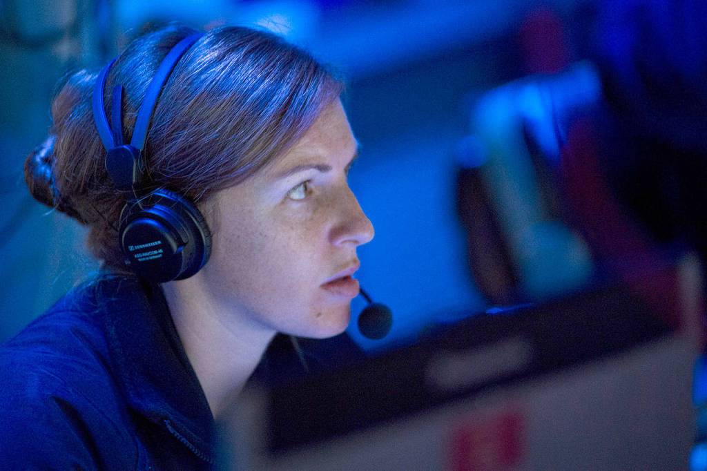 IN THE CORAL SEA — Navy Lt. Megan Ricker of Bremerton makes a report on July 17 during an air defense exercise aboard the guided-missile destroyer USS Sterett (DDG 104).