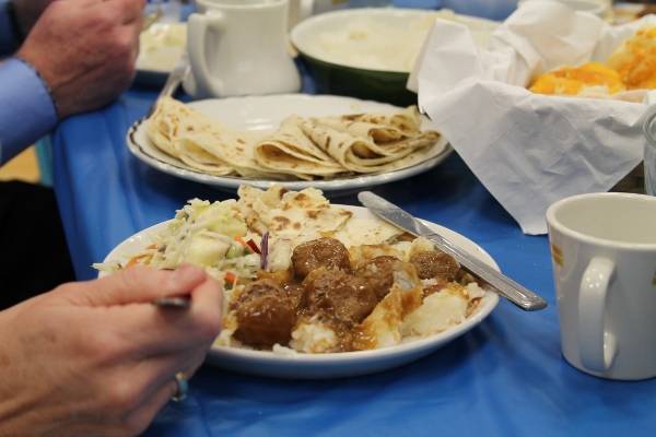 In the back corner of the gymnasium is the serving area, and as diners began taking their seats the area hummed with activity. Thick serving dishes were piled with steaming fish and taken over to the tables to be served family-style. Swedish meatballs, steaming and coated in rich brown gravy, were served up in equally large helpings to all the tables. Volunteers worked tirelessly leading up to the dinner, peeling potatoes and making lefse, a traditional Norwegian flatbread.